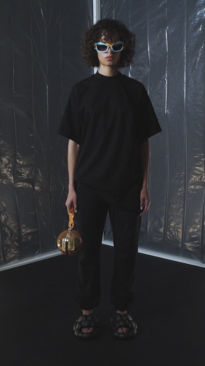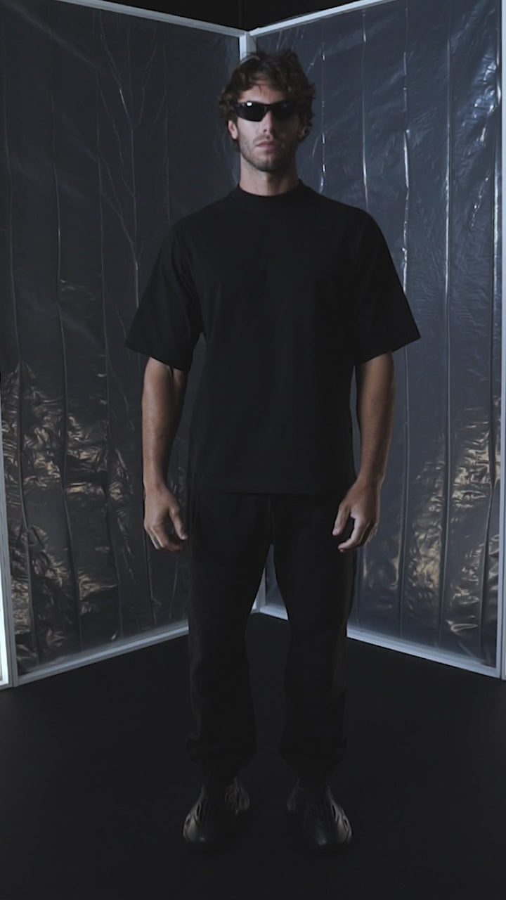 Our Heavy Cotton Black T-shirts feature a contemporary mock neck collar and a modern, oversized fit.