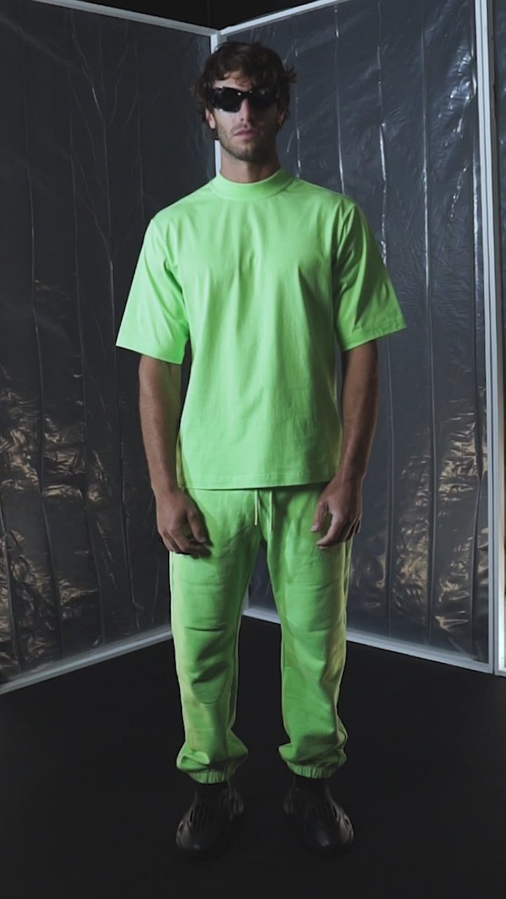 Our Heavy Cotton T-shirts in STLIME feature a contemporary mock neck collar and a modern, oversized fit.