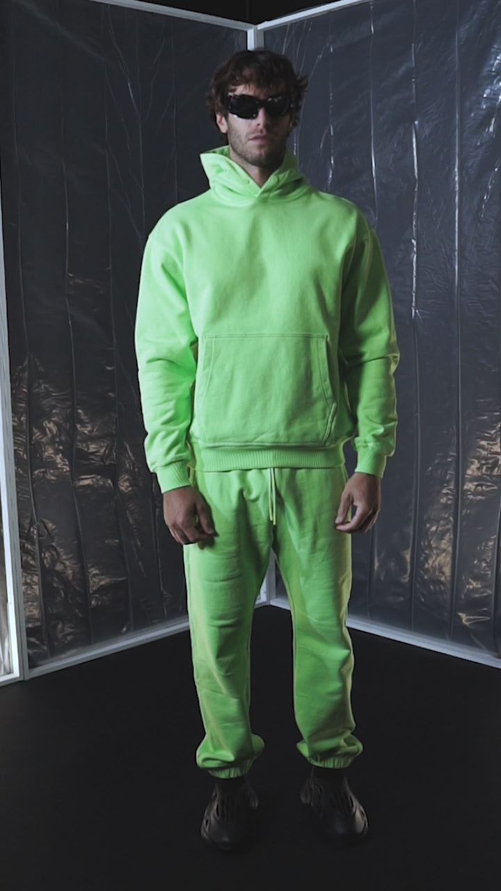 ELIAS is wearing our size Medium Hoodie and Jogger in SLIME. He is 6'2" with a jacket size of 43L and a 32" waist.